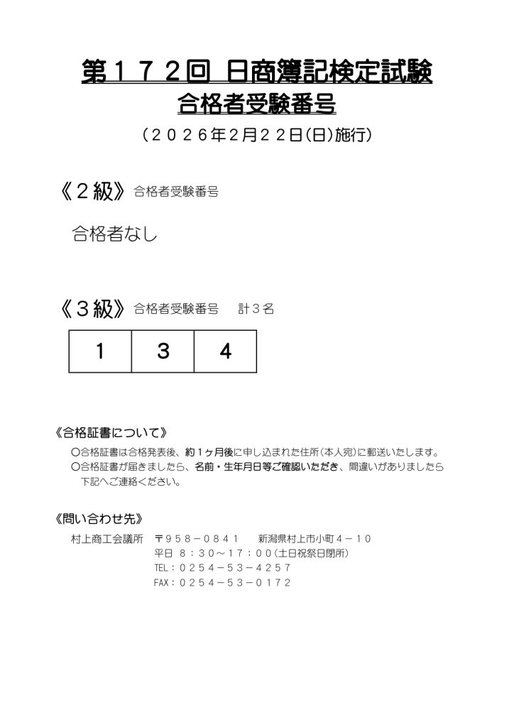 第172回 日商簿記検定試験合格者発表 2026 3/09 新着情報 検定試験 2026/03/09 2026/03/02 新着情報 検定試験 シェアする 令和8年4月18日(土)観光地クリーンアップ作戦を行います!